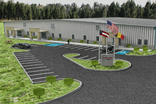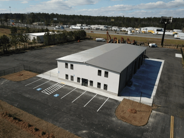A 7,200-square-foot pre-engineered metal building (PEMB) in Richmond Hill, GA, designed for EquipmentShare, a contractor-focused rental business. The facility includes a showroom, warehouse, tech installation center, and fully fenced equipment yard, providing a functional and efficient space for daily operations.