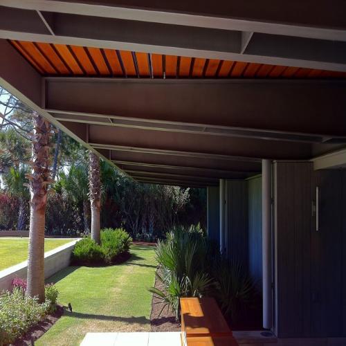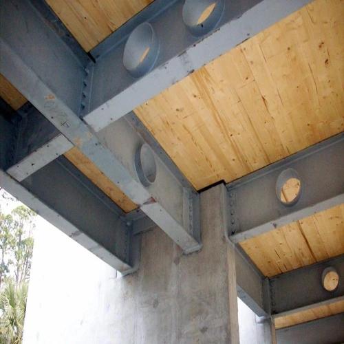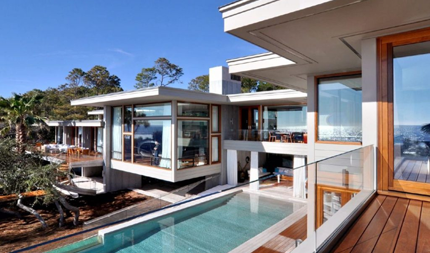 This 12,000 sq. ft. Hilton Head residence, completed in 2011, is a pioneering work of lowcountry-modern design by architect Matt Taylor. The project’s primary challenge was to balance a modern aesthetic—defined by large cantilevers and expansive glass—with the harsh structural demands of a coastal location, including hurricane winds and seismic risks. The solution involved an innovative hybrid structure of steel, concrete, and Cross-Laminated Timber (CLT), supported by a deep auger cast pile foundation. The result is a resilient and visually striking home that stands as a testament to cutting-edge engineering and design.
